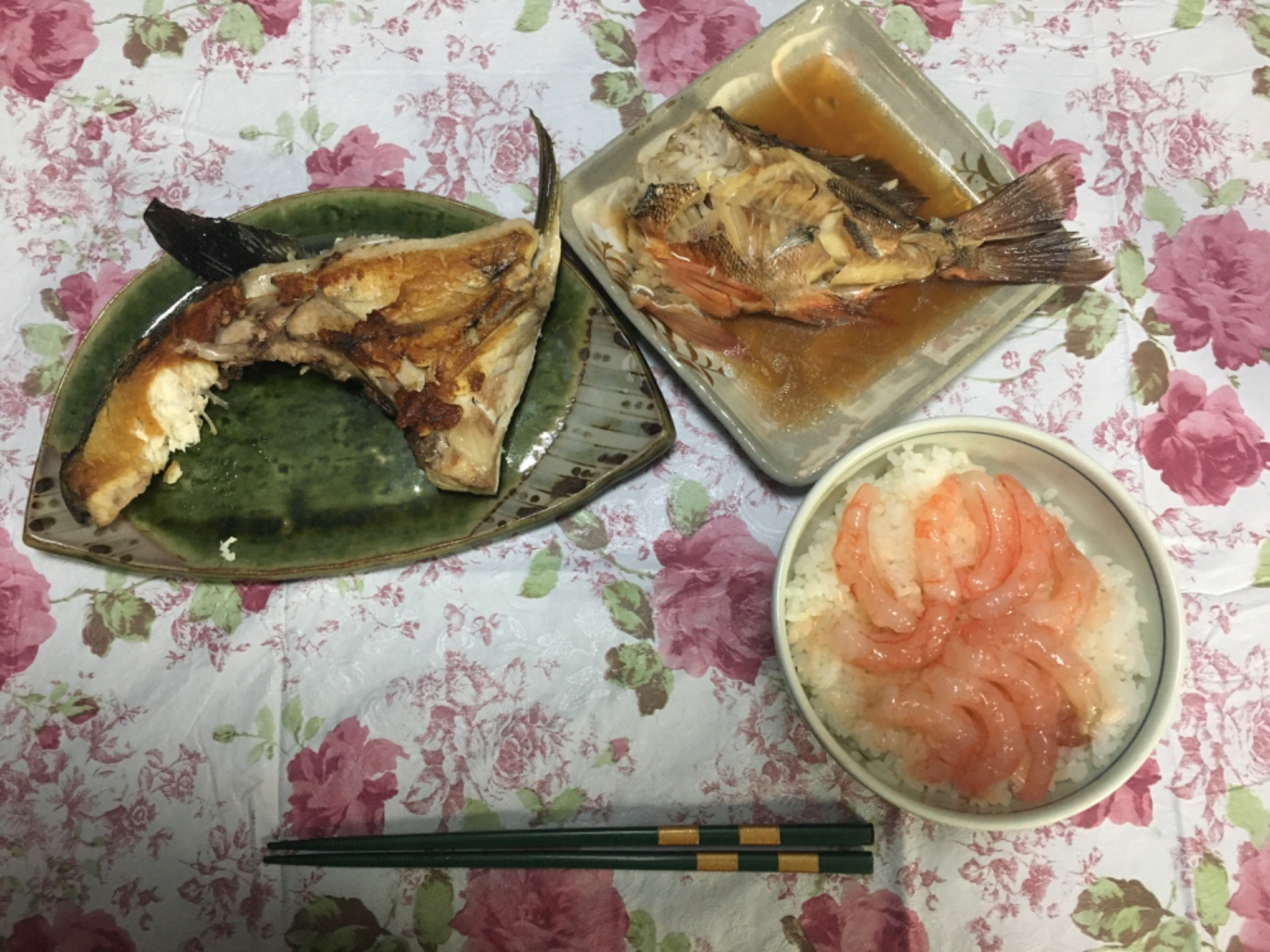 メバルの煮つけ、ブリカマ塩焼き、甘えび丼。