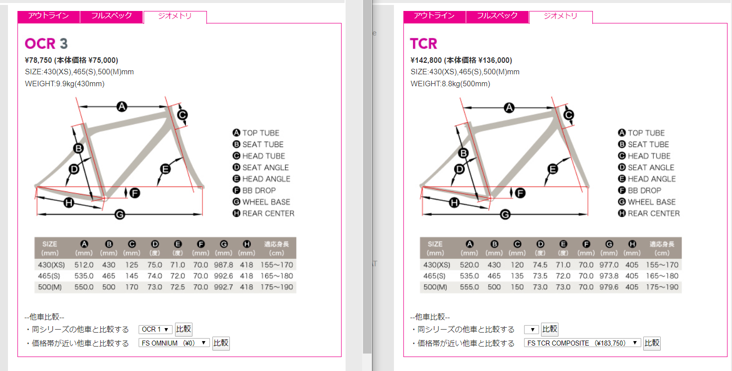 TCRに比べて、OCRの方がヘッドチューブ、リアセンター、ホイールベースが長い。