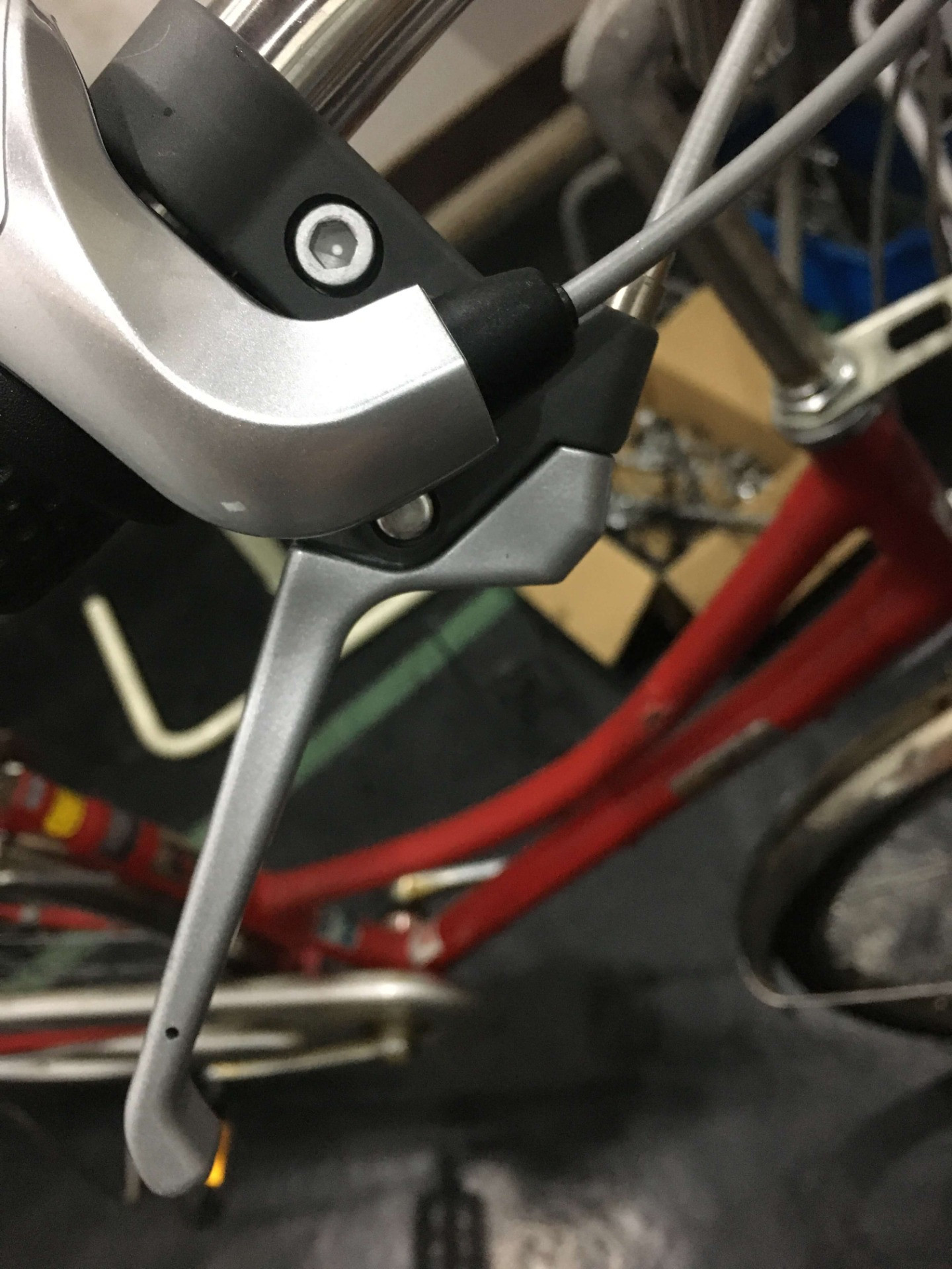全力で握ったら折れそうな劣化したブレーキレバーを外して、新しく取り付けるのも樹脂タイプ。アルミのレバーをだと制動力が上がる場合があるので、アルミ製のブレーキレバーをおすすめする場合が多いのですが、今回は諸事情により、樹脂製の物を採用。