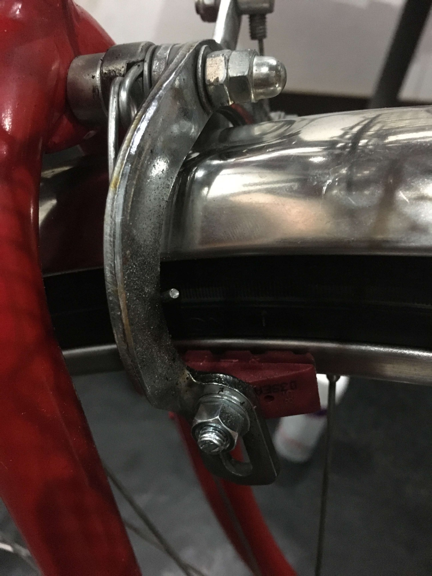 今回使用する物には樹脂がない。その代わりにバネの形が工夫されている。性能に大きな違いは無さそう。私自身、長期に渡ってこの樹脂無しバネのブレーキを使用したことが無いです。これを使っているお客さんもあんまり知りません。だから、しばらく使用してどんなトラブルが起こるのか分かりません。データを取るいい機会なので、今回はこのブレーキを採用しました(笑)。自転車屋さんが「どんなトラブルが起きるのか分からない」なんて言うと不安に感じる人も居るでしょう。安心してください。ブレーキのアームとバネがメタルタッチしているので、その辺の摩耗具合が普通のブレーキと違うかな?という予想とか、なんだかんだ考慮して、このブレーキを採用しているので、安心してください(^-^)