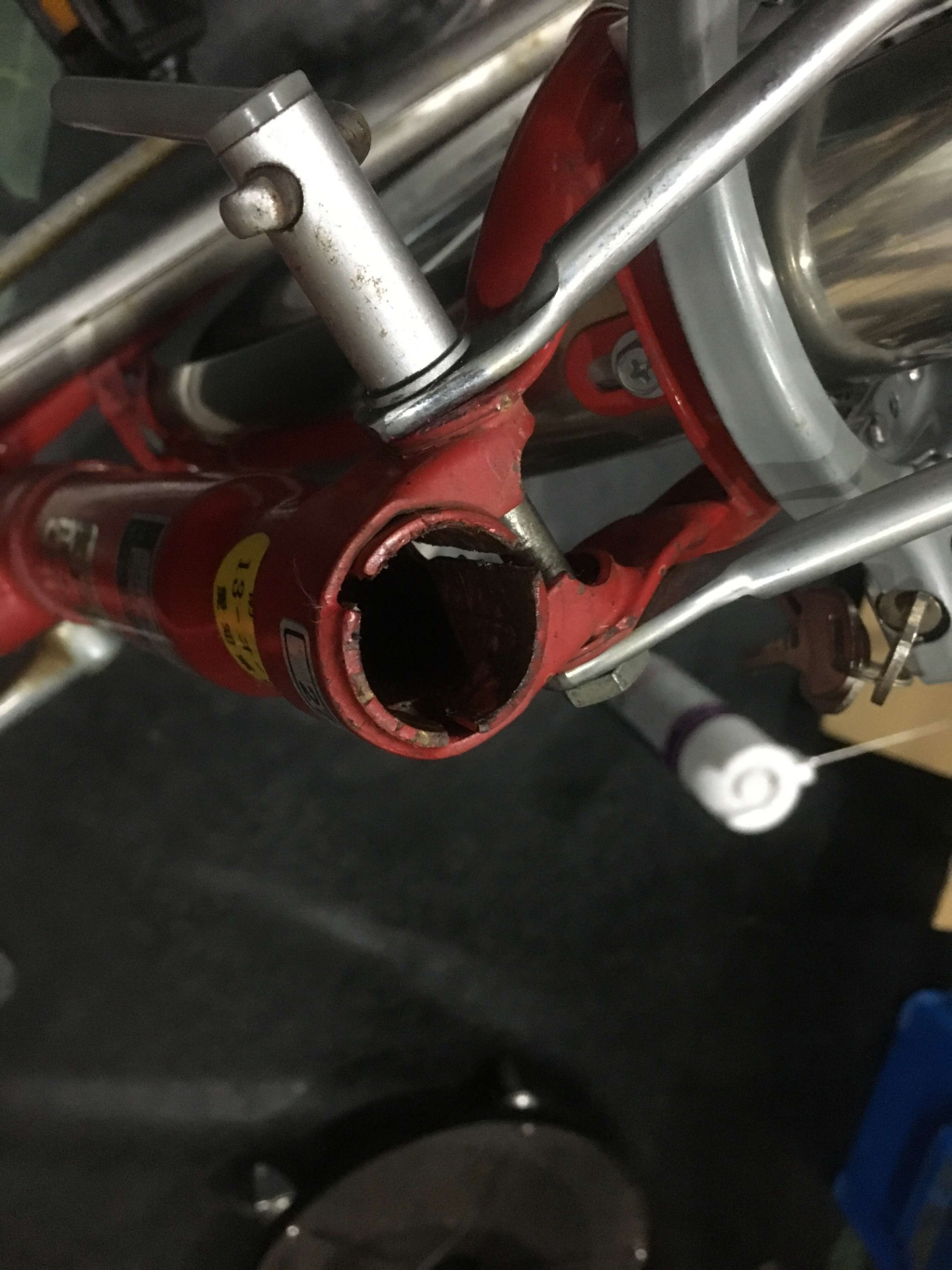 解決策はシートポストが入るフレーム部分(シートチューブ)の穴をギリギリシートポストが入るくらいに狭くしてやればいいのだ。作業手順はシートポストを抜き、空っぽの状態でシートレバーを回す。そうするとフレームがギュギュギュッと縮まっていく。縮めすぎると広げなきゃいけないので作業は慎重に進める。今回は良い感じのサイズにすることが出来ました。