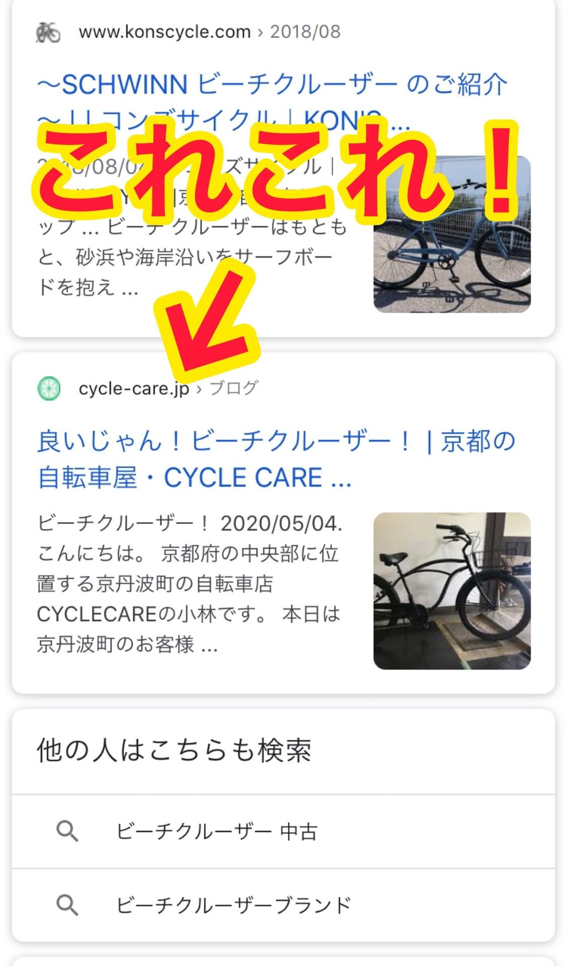 なんでビーチクルーザーの問い合わせが多いんだ?と不思議に思いGoogleで「京都 ビーチクルーザー」で検索したら、サイクルケアが検索順位4位!