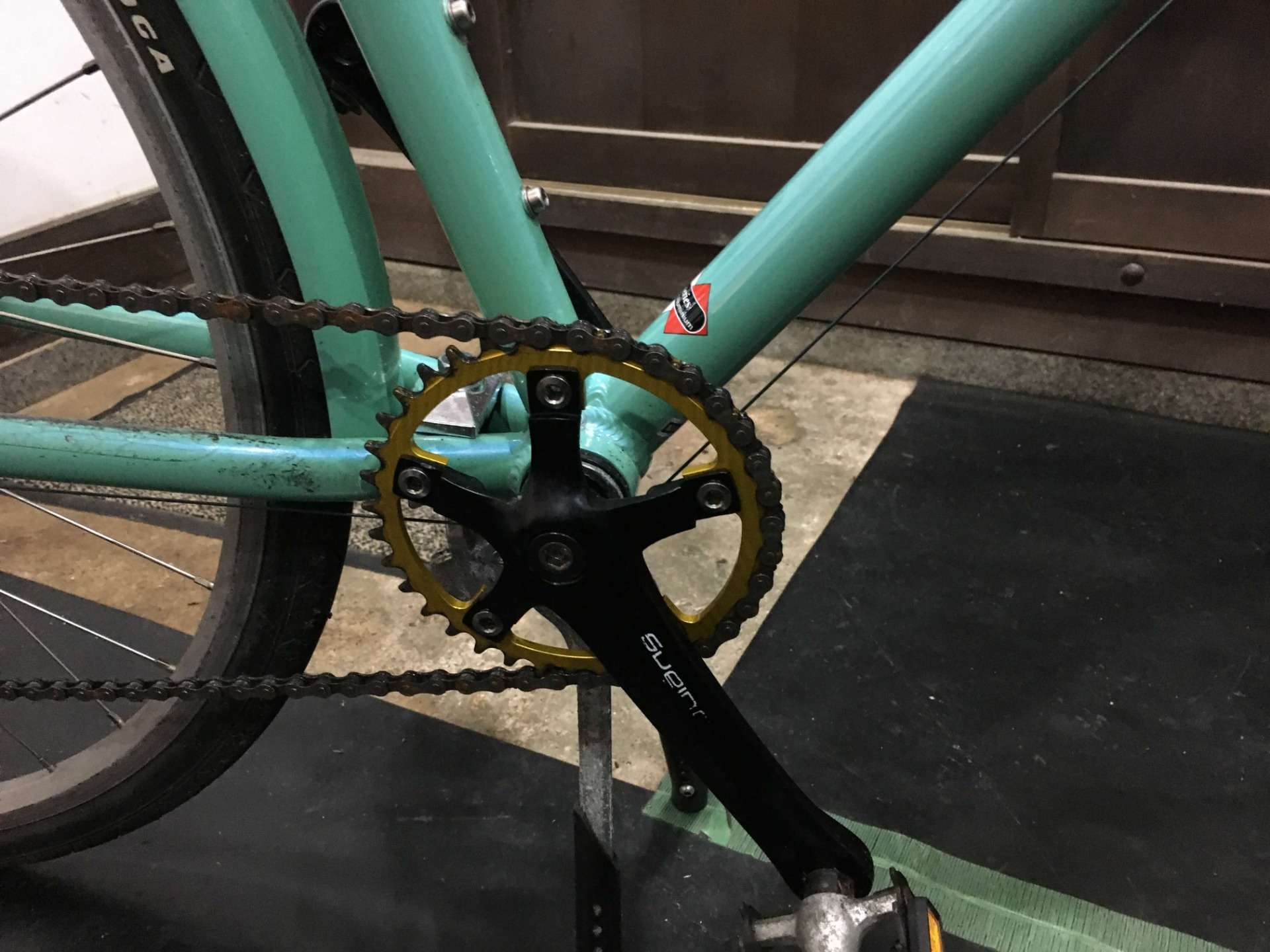 フロントのシングルギア化とは、カスタマイズの1つ。フロントの変速を3段変速→1段(変速無し)にすること。