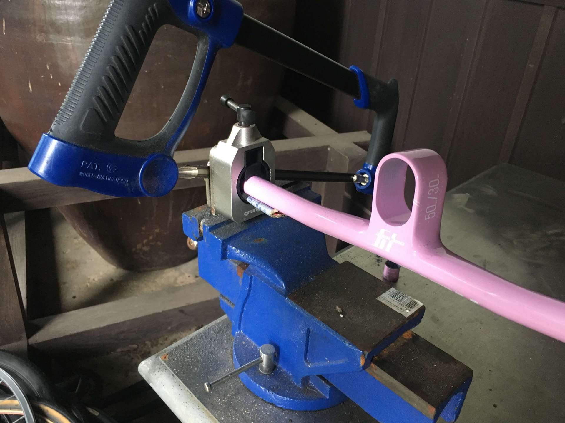 万力にセットして、ノコギリでギコギコ切ります。