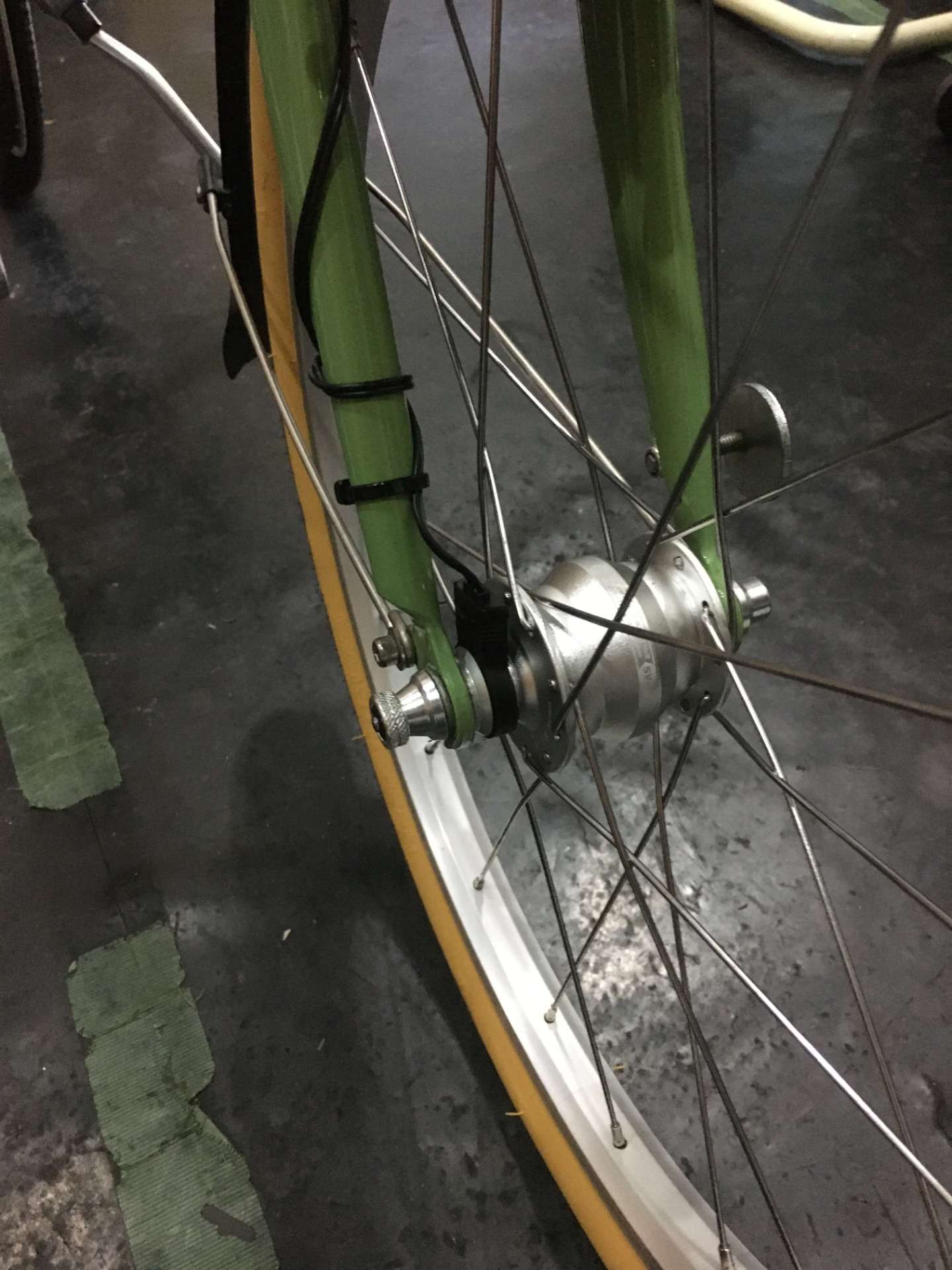 今回はこちらの自転車のフロントハブをハブダイナモにして、オートライト化させました!