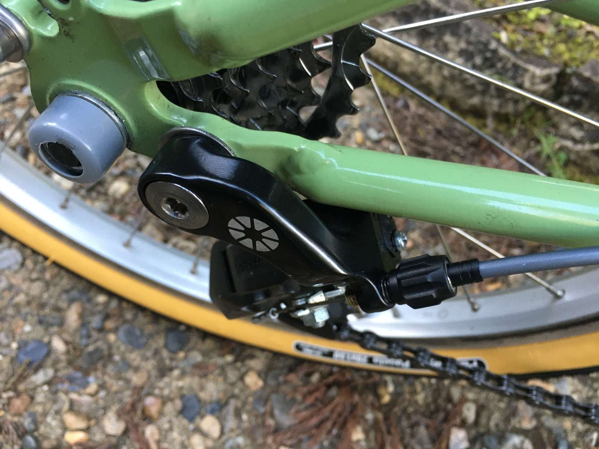 なので、リアディレイラーとフレームとの間にワッシャーを入れて、リアディレイラー全体を車体の外側に出して、トップギアにも入れやすいように工夫をしました。