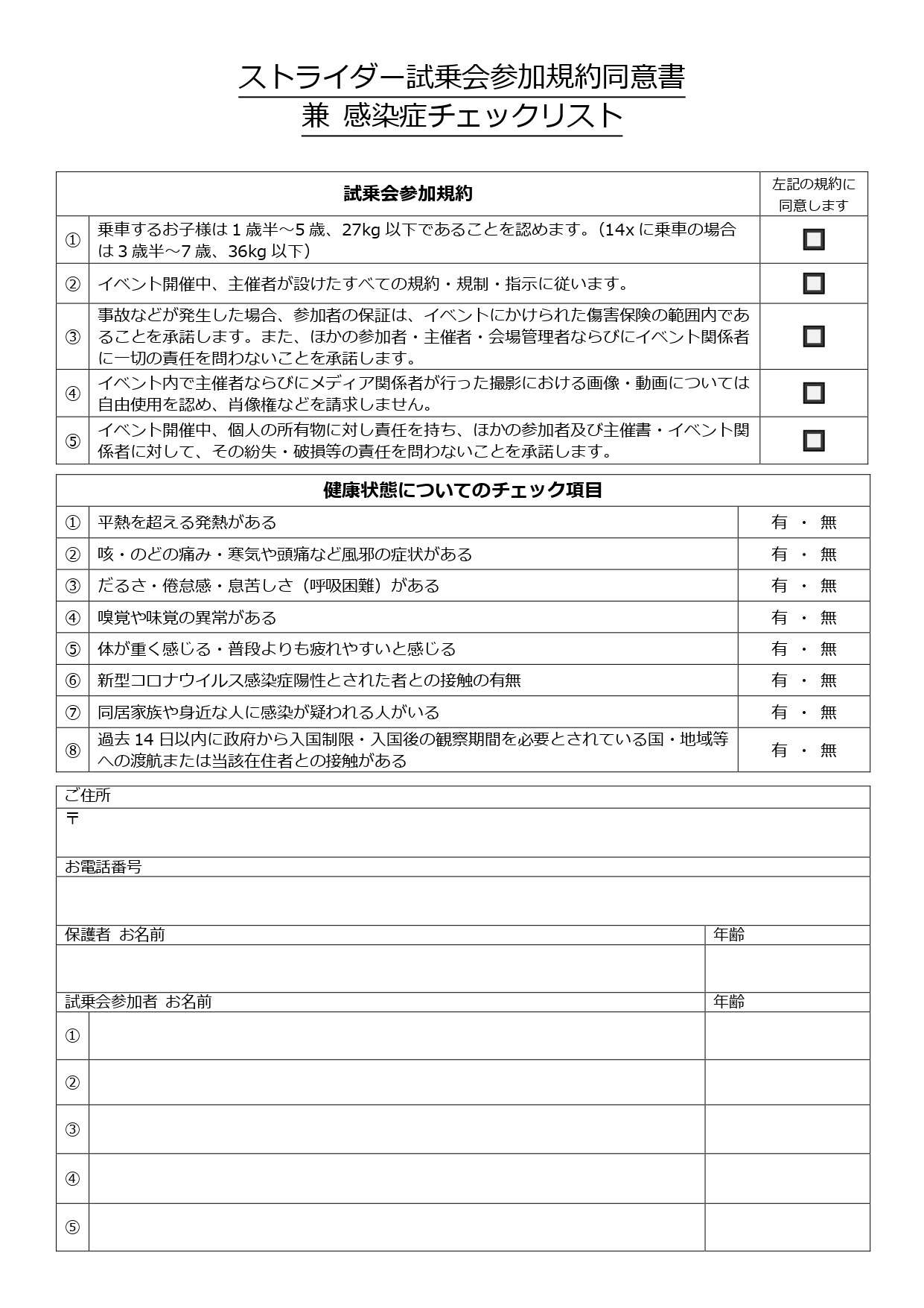 当日は受付けにて「ストライダー試乗会参加規約同意書兼感染症チェックリスト」をご記入いただきます。