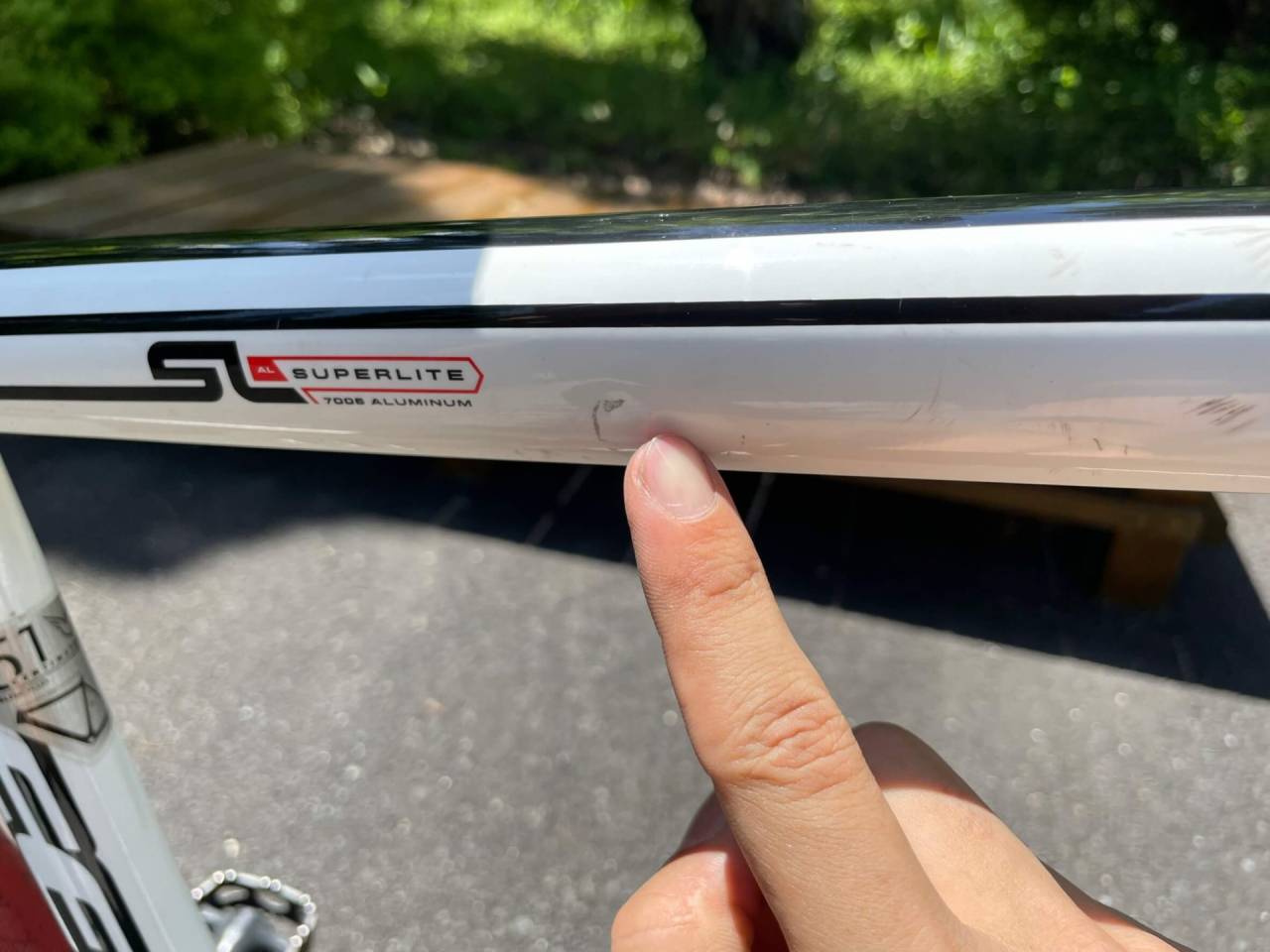 トップチューブに少しヘコみが有りますが、CYCLE CARE店主(85kg)が60km走りましたが、安全に違和感なく走れました👍